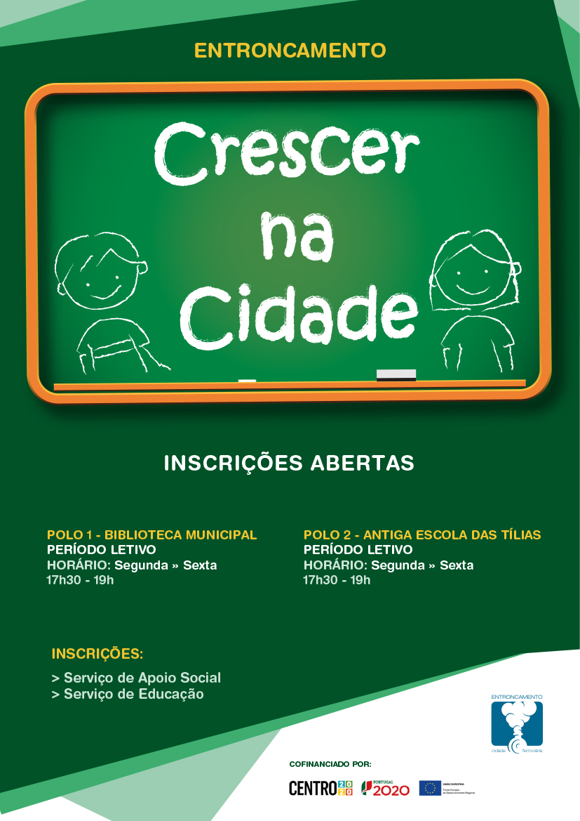 Estão abertas as inscrições para o programa "Crescer na Cidade", para o ano letivo 2019/2020. As inscrições devem ser efetuadas, de segunda a sexta-feira, no serviço de Educação ou no serviço de Apoio Psicossocial do Município.