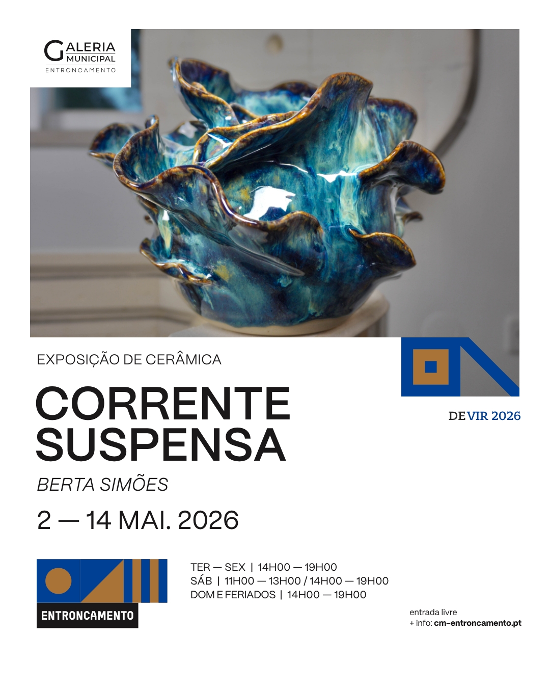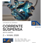 A Exposição de Cerâmica “Corrente Suspensa”, de Berta Simões, será inaugurada no dia 02 de maio, pelas 17h00, podendo posteriormente ser visitada até ao dia 14 de maio, de terça a sexta-feira, entre as 14h00 e as 19h00. Aos sábados entre as 11h00 e as 13h00 e entre as 14h00 e as 19h00, aos domingos e feriados das 14h00 às 19h00.