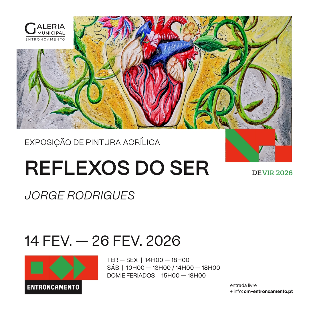 A Exposição de Pintura Acrílica “Reflexos do Ser”, de Jorge Rodrigues, será inaugurada no dia 14 de fevereiro, pelas 17h00, podendo posteriormente ser visitada até ao dia 26 de fevereiro, de terça a sexta-feira, entre as 14h00 e as 18h00, aos sábados entre as 10h00 e as 13h00 e as 14h00 e as 18h00 e aos domingos e feriados, entre as 15h00 e as 18h00.