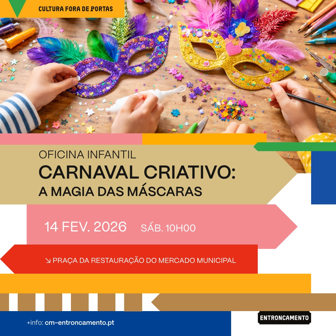 No âmbito do Programa Cultura Fora de Portas, o Município do Entroncamento promove no dia 14 de fevereiro, pelas 10h00, na Praça da Restauração do Mercado Municipal, a Oficina Infantil “Carnaval Criativo: A magia das Máscaras”.