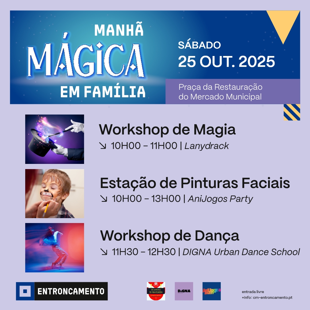 Manhã Mágica em Família, decorre dia 25 de outubro, sábado, entre as 10h00 e as 13h00, na Praça de Restauração do Mercado Municipal do Entroncamento.