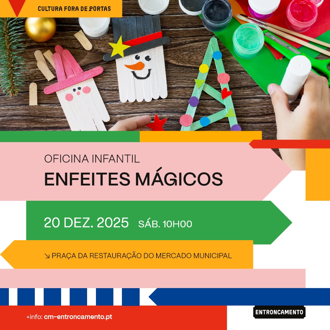 No âmbito do programa Cultura Fora de Portas, do Município, decorre no próximo dia 20 de dezembro, sábado, pelas 10h00, na Praça da Restauração do Mercado Municipal, a Oficina Infantil “Enfeites Mágicos”.