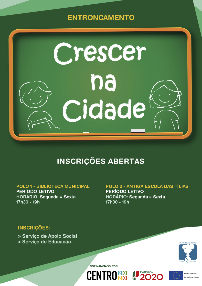 Estão abertas as inscrições para o programa "Crescer na Cidade", para o ano letivo 2019/2020. As inscrições devem ser efetuadas, de segunda a sexta-feira, no serviço de Educação ou no serviço de Apoio Psicossocial do Município.